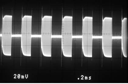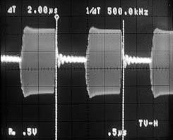 Pulse rate of 3000 Hz. Rise/Fall times 1 microsecond. Leading edge spike of less than 4 microseconds duration, and trailing edge spike measured at less than 3 microseconds duration.