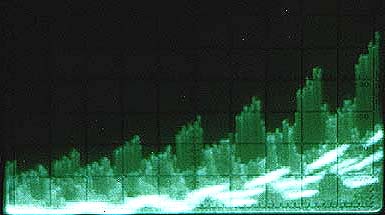 Spectral output of a portion of one sideband generated by the plasma tube. In this picture are hundreds of vertical lines, each single vertical line is an individual frequency. All of these hundreds of frequencies are generated simultaneously, and each frequency is harmonically related. Each of these frequencies has a unique phase angle and impedance value within the side band. Changes in the audio frequency will create an entirely different set of frequencies.