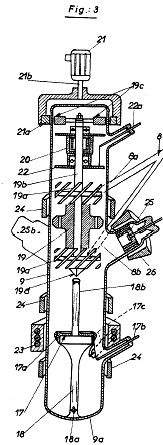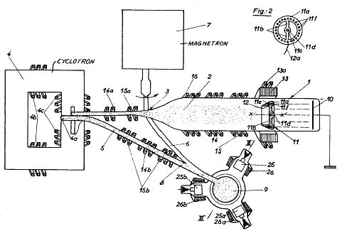 Conduit 8 communicates with tube 9 via a plurality of pipes such as 8a and 8b directed at a certain angle, along vertical planes, towards plates 19a, said angle being preferably in the region of 22.5 degrees, About cathode 17 is disposed an electromagnet 23 similar to the electromagnet 13 of radiating tube 1. About tube 9 are likewise disposed accelerating coils 24. At the points shown on the drawing, tube 9 also includes three electrodes 25, 25a and 25b surrounded respectively by coils 26, 26a and 26b. On the drawings are also represented the feeders 17b and 17c of the cathode and its filament, and 22a of the anode.