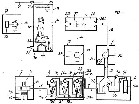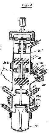 In Figure 5, the disposition of the conduits with respect to tubes 1’ and 9’, magnetron 7’ and cyclotron 4’, differs from that of Figure 1 and has been used with success by the applicant. The waveguide 6’ of magnetron 7’ is connected to the extremity of tube 1’, while conduit 3’ conveying the resulting radiation divides into two branches: branch 25 surrounded by accelerating coils 14c’ and 15c’, which conveys the radiation directly to tube 9’ and branch 37 which conveys its to cyclotron 4’. The latter arrests the electromagnetic radiation and accelerates the radiated particles which are dispatched into tube 9’ through conduit 38.