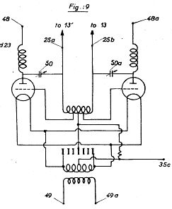 Tube 1’ includes a first electrode 11’ exactly similar to the cathode 11 of tube 1, and a second identical electrode 39 provided with a heating filament 39a. Tube 9’ (see Figure 6) includes in its lower part a first electrode 17’ with its heating filament 17’a, and a second identical electrode 40 with its heating filament 40a.