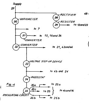 The power supply circuit diagram is shown on Figure 4. The main supply 27 supplies low-voltage alternating current to a first branch comprising a rectifier 28 (a kenotron, for instance), the rectified current from which is modulated to a rate adjustable between 30 and 120 pulses per minute by means of a resistor 29 the control system of which will be described hereinafter with reference to Figures 7 and 8. The current modulated thus is applied to electromagnets 13 and 23 whereby to cause them to generate, at the level of cathodes 11 and 17, a modulated unidirectional field of 10,000 to 20,000 gauss.