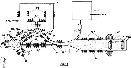 The two semi-circular boxes or D’s 4a of cyclotron 4 are placed in the customary fashion between the frame poles, and said frame is surrounded by accelerating windings 4b and 4c.