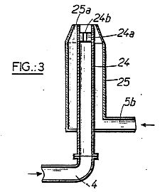 In Figure 5, the disposition of the conduits with respect to tubes 1’ and 9’, magnetron 7’ and cyclotron 4’, differs from that of Figure 1 and has been used with success by the applicant. The waveguide 6’ of magnetron 7’ is connected to the extremity of tube 1’, while conduit 3’ conveying the resulting radiation divides into two branches: branch 25 surrounded by accelerating coils 14c’ and 15c’, which conveys the radiation directly to tube 9’ and branch 37 which conveys its to cyclotron 4’. The latter arrests the electromagnetic radiation and accelerates the radiated particles which are dispatched into tube 9’ through conduit 38.