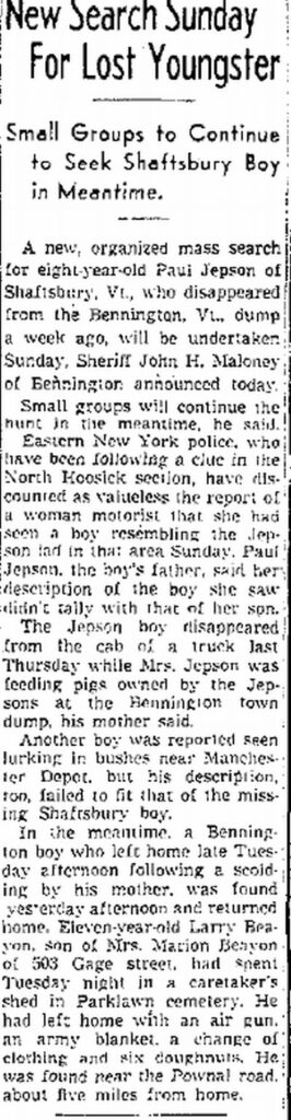 October 12th, 1950. Eight year-old Paul Jepson had wandered off near the area of Bennington. Where four years earlier Paula Welden vanished. Paul’s mother had asked him to stay inside the truck while she tended to the family’s pigs. The feeding took only a few minutes but when she had returned to her truck, her son had vanished.