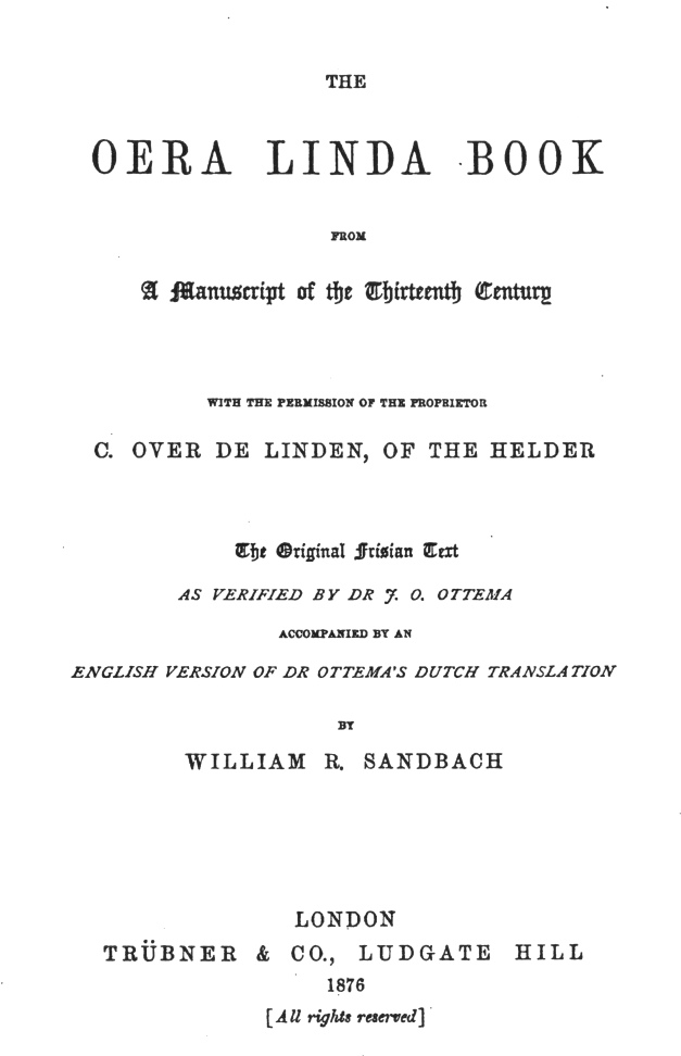 PRODUCTION NOTES: I was unable to obtain a printed copy of this edition, so I printed out and scanned back in a Google page image PDF, which does not give the best OCR yield. Hence there may still be OCR errors lurking in this text. I had to omit the parallel Frisian text on facing pages for technical reasons. Most of the footnotes in the body of the text had to be placed at an inferred position, as for the most part the footnotes refer to the Frisian text, not the English. For this reason the place name references in the footnotes are logically reversed. As far as I can tell, this is the first time that an unmodified transcript of this translation of the Oera Linda Book has appeared online.–J.B. Hare, January 29th, 2009.