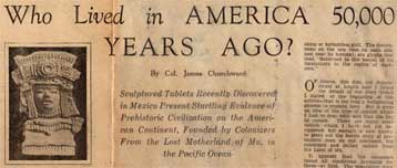 Fifty thousand years ago, or more, before the early cave dwellers of Spain had inscribed their records in cavern paintings, and of course long before the first rudiments of civilization appeared in Egypt, a small craft sailed forth from the continent that then existed in the middle of the Pacific Ocean. It sailed into the rising sun, manned by a crew of blond sailors whose mil-white skin and blue eyes marked them as natives of the Land of Mu, the birthplace of mankind. After sailing for ?a moon?s journey? (twenty-eight days) they sighted land ? land which we now know as North America, but nameless then with no trace of human beings.
